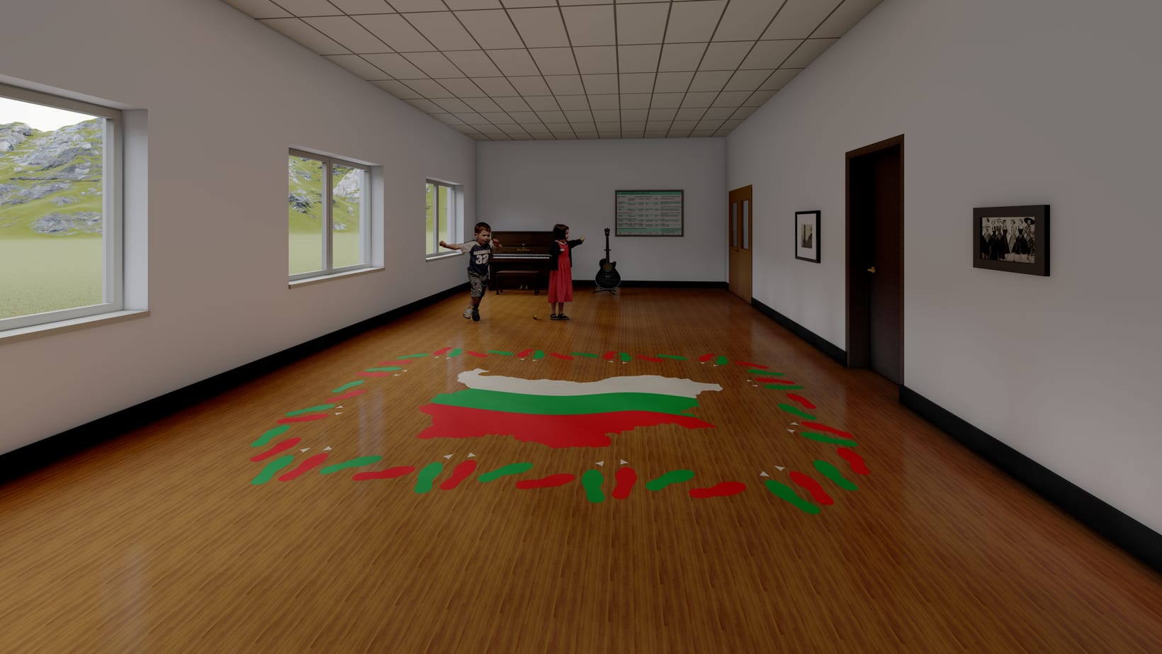 Конкретният проект представлява карта на България изобразена в цветовете на българското знаме. Около картата са подредени стъпки, които проследяват стъпките на типичното българско „Право хоро“. Всички стъпки са оцветени в зелен и червен цвят, като цветовете съотвестват ляв или десен крак. Пред някои от стъпките има изобразени бели стрелки, които да показват движение с крака напред. Стъпките проследяват точно хорото, като дават възможност на децата чрез игра да се запознаят с българският традиционен танц. Стъпките за хорото следват елипса, като дават възможност за непрекъснато движение. Обикаляйки около картата на България, децата се запознават с географската форма на страната, а чрез танцуването на традиционни танци се цели повишавне на вниманието на децата към традициите и обичаите на България.